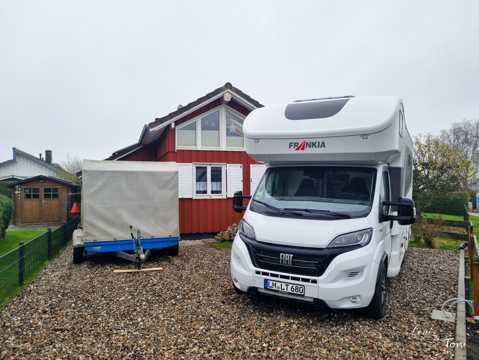 Es ist fast geschafft! Wir sind mit der letzten Fuhre unterwegs und Gustav kommt endlich in sein neues Zuhause. Den Anhänger mit all seinen Sachen (Campingstühle, die Rädchen, der Roller, die Rollerbühne und die ganzen Reste, die noch übrig sind) zieht er selber einwandfrei bis nach Hause. Ich fahre mit dem VW Bus hinterher - wie klein er gleich aussieht hinter unserem Gespann 😅