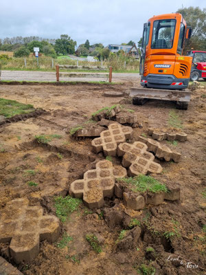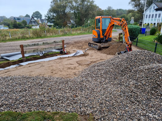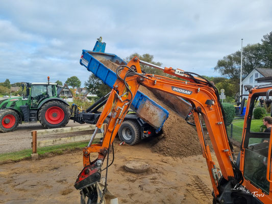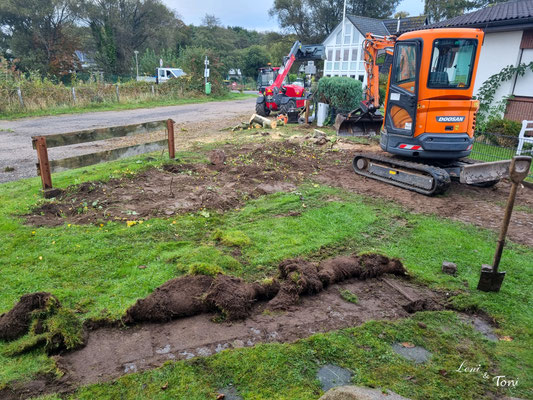 Später kommt noch ein zweiter Bagger dazu plus drei Mann und los gehts. Bis heute Abend haben sie tatsächlich die gesamte Einfahrt schon einmal auf links gedreht.