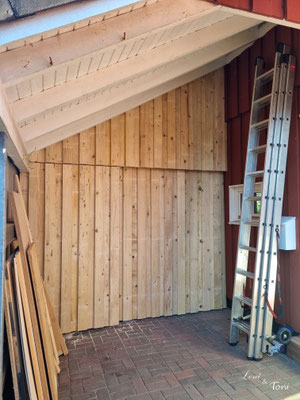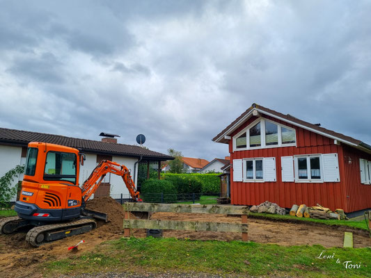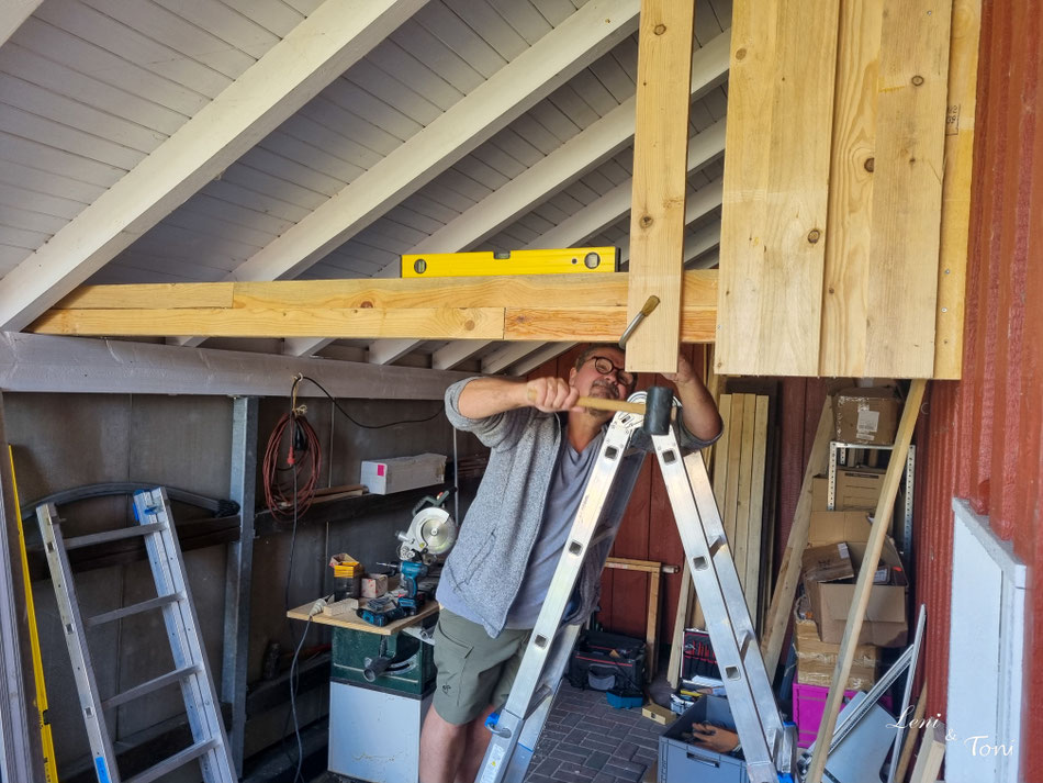 Wir sind gut angekommen und Toni beginnt damit, eine Wand ins Carport einzuziehen, damit wir ein bisschen mehr Stauraum haben.