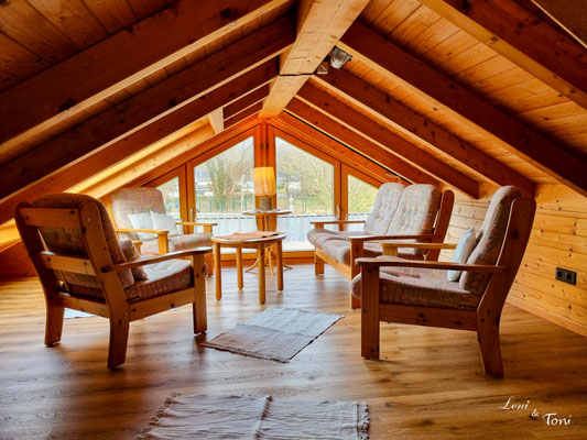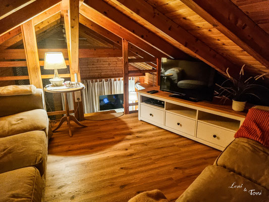 Die Couchen sind untergebracht und wir haben jetzt eine richtig schöne Kuschelecke unter dem Dach. Es passt alles richtig gut hier oben hin und wir haben es sogar geschafft, den Schreibtisch unter das Dachflächenfenster zu stellen und er wird von vorne so gut von der Couch verdeckt, dass man ihn gar nicht sehen kann, wenn man auf der Couch sitzt. Dafür hat man jetzt vom Schreibtisch aus den allerschönsten Blick auf die Schlei, ich kann es nicht fassen, dass alles so gut hier reingepasst hat 😍🙏