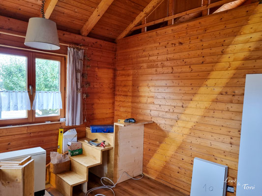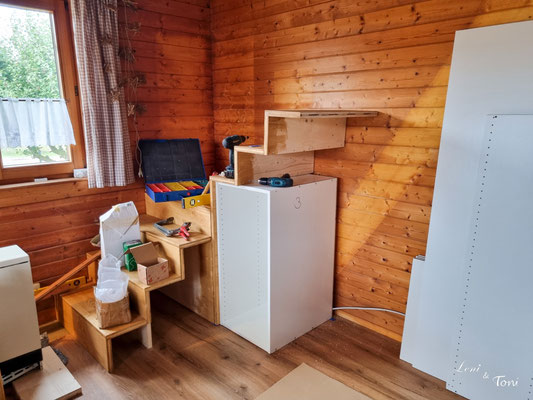 Die bisherige Treppe ist einfach zu eng und steil und auf Dauer nicht gut zu laufen. Da es sich um eine Raumspartreppe handelt, kann Clara auch nicht alleine runter und hoch geht sie auch nur, wenn sie niemanden überreden kann, sie hochzutragen. Daher hat Toni die neue Treppe so geplant, dass sie breiter ist und über ein Podest um die Ecke führt. Untendrunter kommt ein Schrank, ansonsten bekommen wir unsere ganzen Sachen nicht unter.