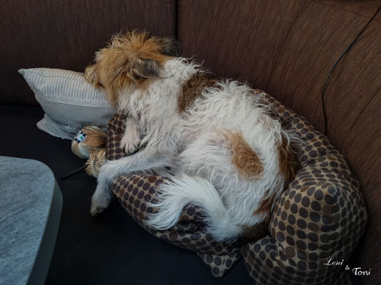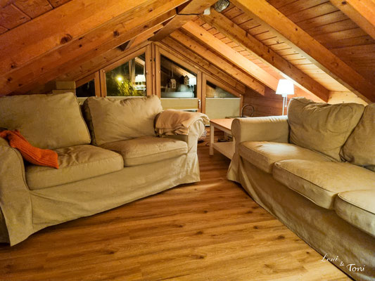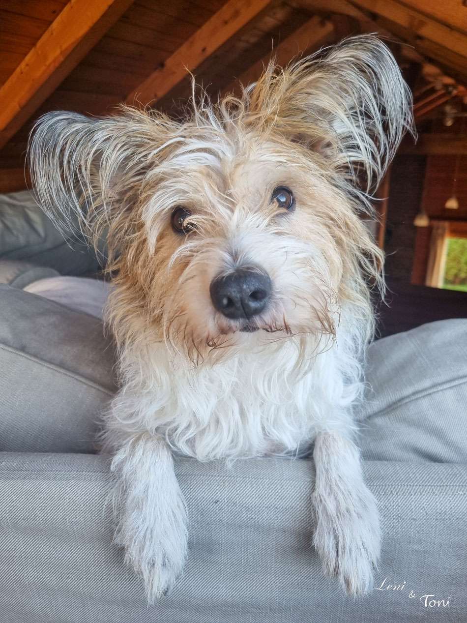 Erstmal das Wichtigste: Clara ist begeistert von unserer neuen Kuschelecke hier oben. Sie braucht ja immer einen Platz, von dem aus sie rausschauen kann und von hier oben kann sie wirklich alles ganz genau beobachten. Ihr Körbchen liegt direkt am Fenster mit bester Aussicht und wenn sie auf der Couch liegt, kann sie sowohl aus dem Fenster rausschauen, oder zu uns nach unten oder sie hält uns vom Arbeiten ab, weil sie jetzt einfach über die Couch zu unser rüberklettern kann und beobachtet, was hier so passiert. Also, ich soll liebe Grüße an Euch alle ausrichten 🐶