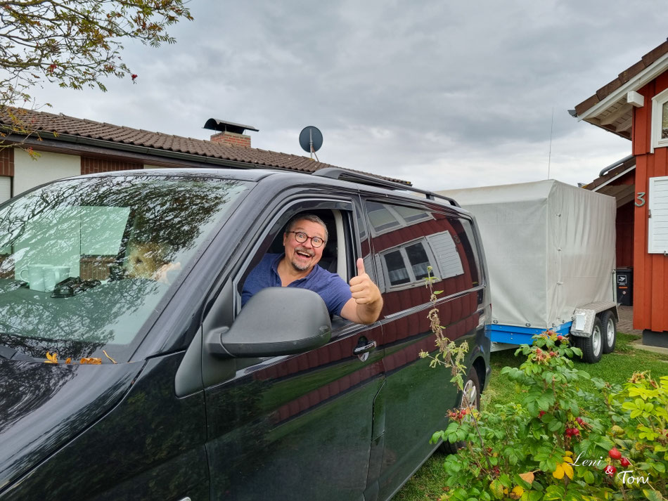 Es ist fast geschafft! Wir sind mit der letzten Fuhre unterwegs und Gustav kommt endlich in sein neues Zuhause. Den Anhänger mit all seinen Sachen (Campingstühle, die Rädchen, der Roller, die Rollerbühne und die ganzen Reste, die noch übrig sind) zieht er selber einwandfrei bis nach Hause. Ich fahre mit dem VW Bus hinterher - wie klein er gleich aussieht hinter unserem Gespann 😅