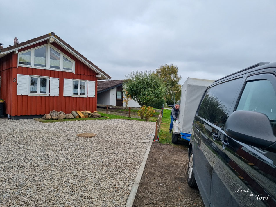 Morgen geht es wieder nach Hause. Wobei der Begriff nach Hause ja eigentlich so auch nicht mehr richtig ist. Aber wir sagen im Moment zu beidem "Zuhause". Auf jeden Fall sind die Arbeiten in der Einfahrt beendet, der Kies ist verteilt und die Begrenzungssteine sitzen. Toni ist mit der Treppe fertig, der Anhänger ist leer und hängt wieder an. Es kann also wieder los gehen....
