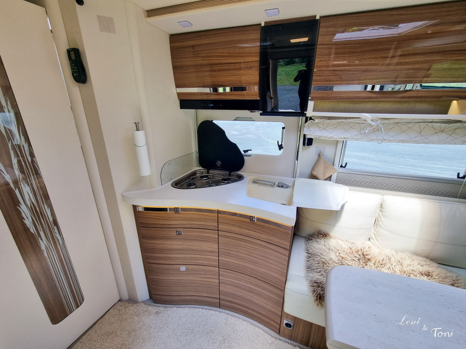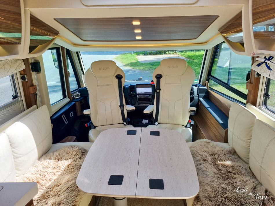- Grundrissvariante Face-to-Face (gerade Küche und Sofa) mit ausklappbarem Wohnraumtisch mit verschieb- und drehbarer Tischplatte