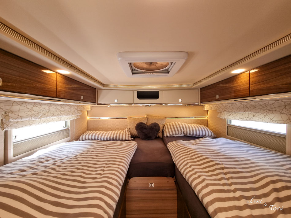 - zwei Längsbetten im Heck, die durch ein Mittelstück zu einer großen Liegefläche verbunden werden können